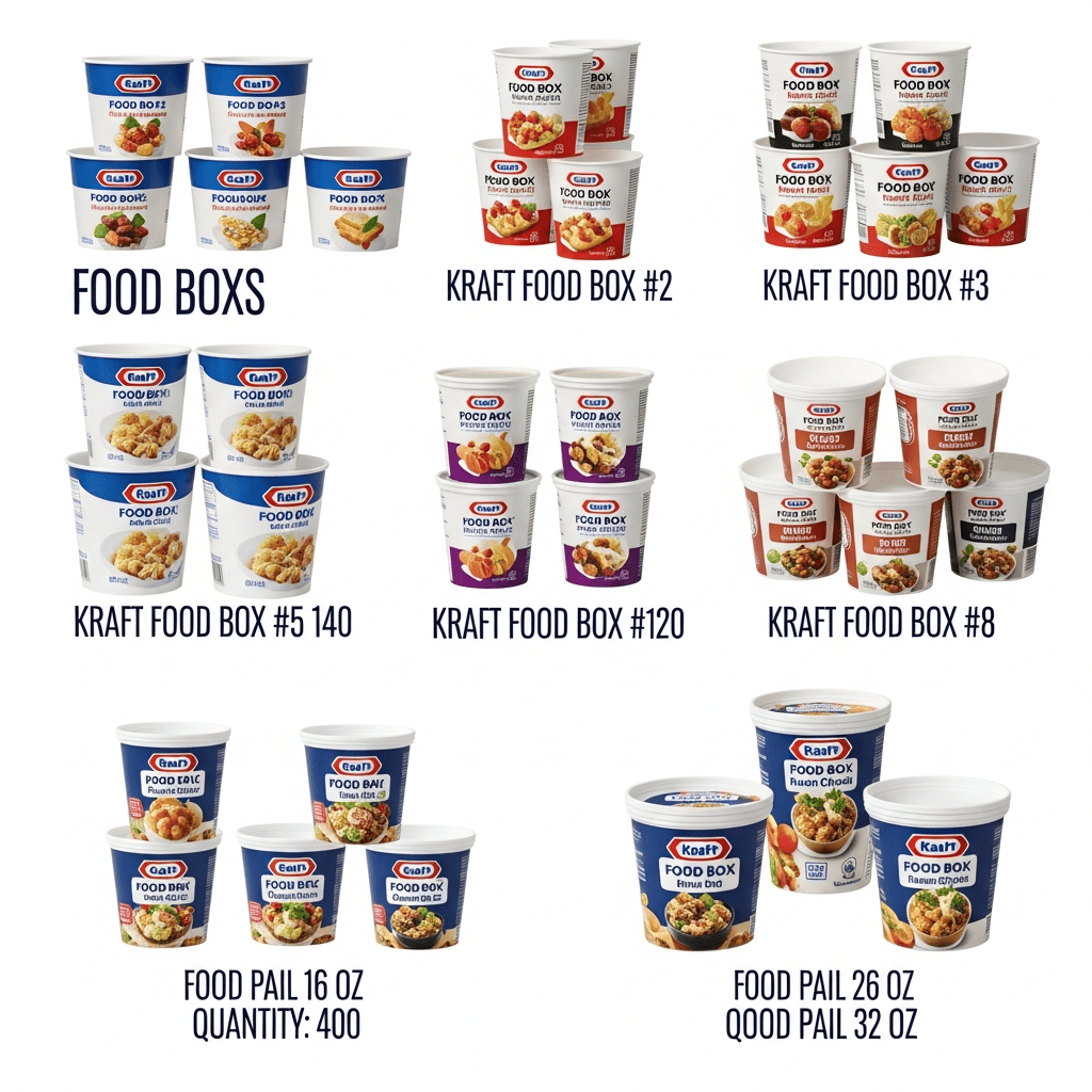 • KRAFT FOOD BOX #3 (QTY:200) • KRAFT FOOD BOX #4 (QTY:160) • KRAFT FOOD BOX #5 (QTY: 140) • KRAFT FOOD BOX #6 (QTY: 120) • KRAFT FOOD BOX #7 (QTY: 100) • KRAFT FOOD BOX #8 (QTY: 300) • FOOD PAIL 8 OZ