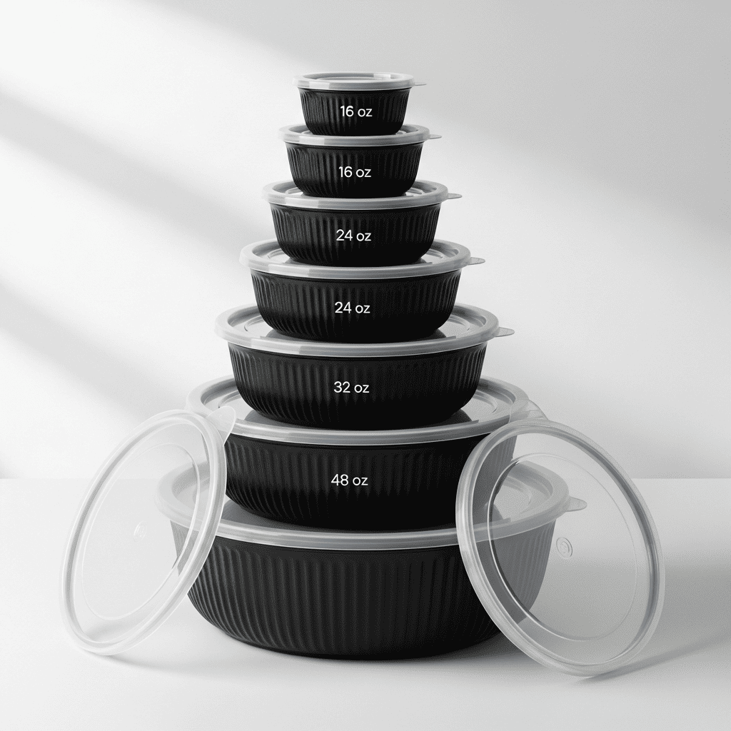 ROUND MICROWAVABLE BLACK COMBO 16 OZ (QTY: 150) ROUND MICROWAVABLE BLACK COMBO 24 OZ (QTY: 150) ROUND MICROWAVABLE BLACK COMBO 32 OZ (QTY: 150) ROUND MICROWAVABLE BLACK COMBO 48 OZ (QTY: 150)